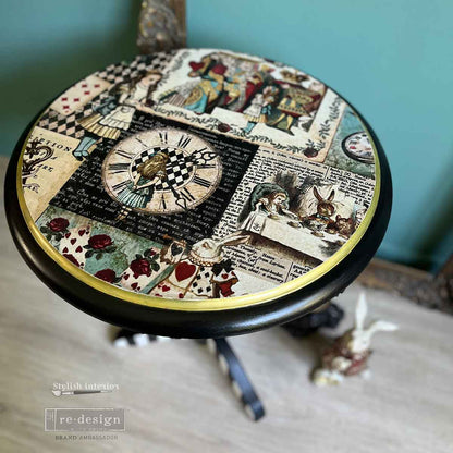 Let your creativity run wild with the “Curious Journey” Découpage Décor Tissue Paper. This design is like a scrapbook of Wonderland’s most delightful moments, pieced together in a way that brings your projects to life. From the quirky checkered patterns to the whimsical illustrations of Alice’s world, every inch of this tissue paper adds a burst of character and charm. The warm, vintage tones blend seamlessly with playful details, turning any piece of furniture or decor into a storybook wonder.